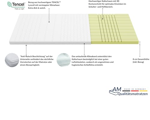 Der hochwertige Kaltschaum Topper (200 x 210 cm, ca. 8cm hoch, RG50) von AM Qualitätsmatratzen verfügt über einen besonderen 3D Konturschnitt, welcher abseihen Zonen erzeugt. Dies erhöht die Punktelastizität und ermöglicht eine maximale Version an den Körper ohne die benötigte Stützkraft einzubüßen. Durch das hohe Raumgewicht ist der Topper besonders langlebig. Für maximalen, langanhaltenden Liegekomfort!