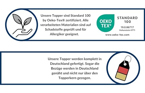 Qualität Made in Germany: Unsere Topper werden komplett in Deutschland gefertigt. Sogar die Bezüge werden in Deutschland genäht – und nicht wie bei vielen anderen Anbietern, die mit Made in Germany werben, lediglich in Deutschland über den Topper-Kern gezogen. Dieses Produkt ist OEKO-TEX Standard 100 zertifiziert (19.0.86717 Hohenstein HTTI). Alle verarbeiteten Materialien sind auf Schadstoffe geprüft und für Allergiker angemessen.