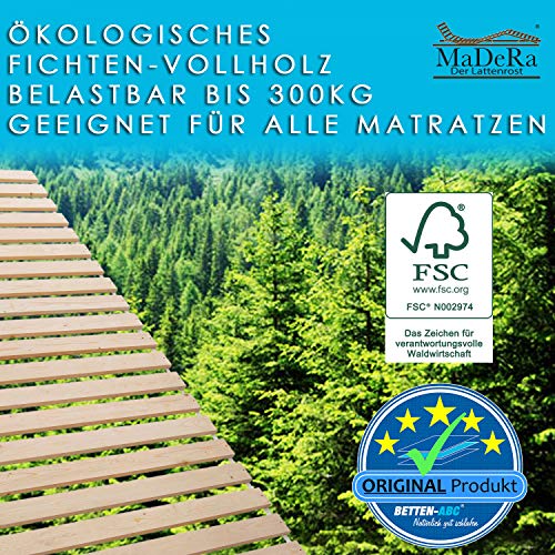 ECHTES FICHTENHOLZ: Die Holzlatten sind die Gesamtheit Fichtenholz und in echter Qualitätsarbeit hergestellt. Anstatt idealen Trage- und Schlafkomfort, FSC zertifizierte Waldwirtschaft.