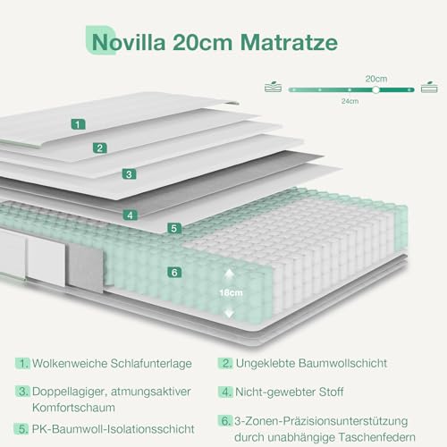 Über die Novella-Matratze: Schlafqualität ist wichtig, und jeder möchte sich nach einem erholsamen Schlaf erfrischt fühlen, und das ist nicht möglich ohne eine Matratze, die Ihren Bedürfnissen entspricht. Nach dem Feedback unzähliger Nutzer und der Prüfung von Materialien haben wir diese Matratze speziell für Sie entwickelt. Die meisten unserer Kunden sind mit unserem Produkt zufrieden.