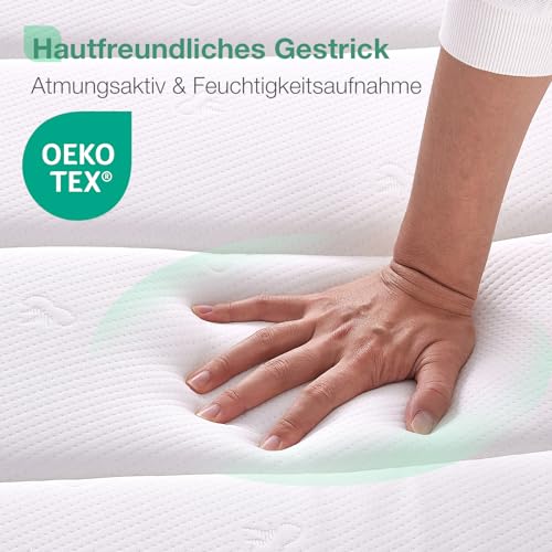 HAUTFREUNDLICHER OEKO-TEX-Stoff: Unser Stoff wurde auf Pilling getestet und ist OEKO-TEX-zertifiziert. Hautfreundlich, weich und atmungsaktiv, besonders geeignet für Personen, die leicht schwitzen, um ihnen eine kühle Nacht zu ermöglichen. Zudem ist er strapazierfähig und verlängert die Lebensdauer der Matratze.