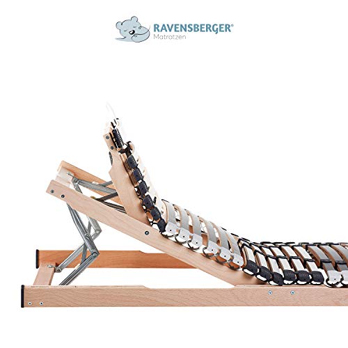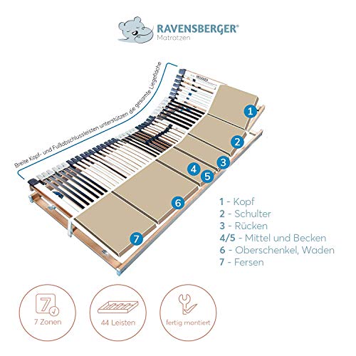 RAVENSBERGER MEDIMED 44-Auflösen 7-Zonen-BUCHE-Lattenrahmen in Premiumqualität von Ravensberger Matratzen – Verstellbar (alternativ vulgo als starres oder elektrisches Modell erhältlich) – Bauhöhe: 9 cm – Belastung: in den Größen bis 100 cm Breite bis 130 kg, ab 120 cm bis 180 kg – Mittelzonen-Härtegrad neunfach einstellbar, sowie holmübergreifende Leistenlagerung zur Vermeidung der Besucherritze – Stabiler Federholzrahmen – Breite Kopf- und Fußleiste
