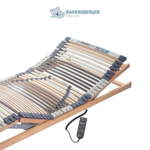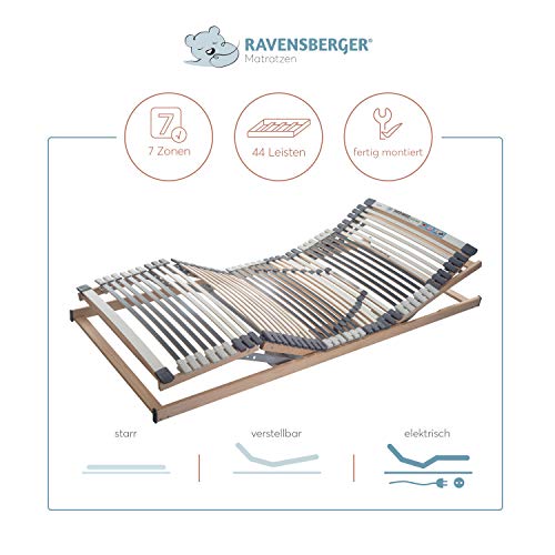 RAVENSBERGER MEDIMED 44-Auflösen 7-Zonen-BUCHE-Lattenrahmen in Premiumqualität von Ravensberger Matratzen – Elektrisch (innovativ alias qua starres oder manuell verstellbares Modell erhältlich) – Bauhöhe: 9 cm – Belastbarkeit bis 100 cm Breite bis 130 kg, ab 120 cm bis 180 kg – Mittelzonen-Härtegrad neunfach einstellbar, sowie holmübergreifende Leistenlagerung zur Vermeidung der Besucherritze – Stabiler Federholzrahmen – Breite Kopf- und Fußleiste
