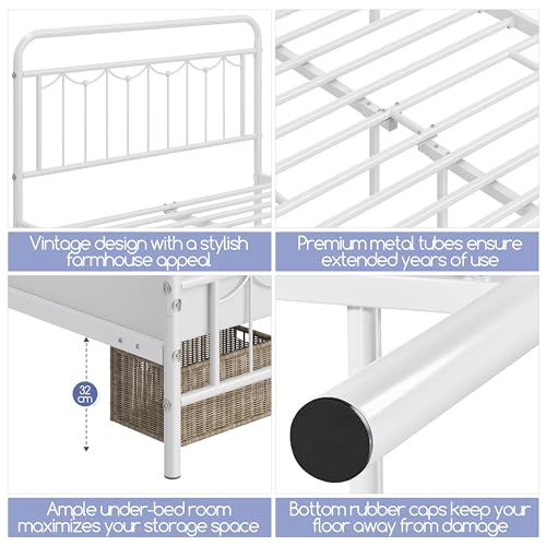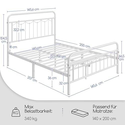 Yaheetech Bettrahmen 140 x 200 cm Einzelbett aus Metall, Bettgestell im Vintage-Stil, Retro Elegantes Metallbett mit Lattenrost & Hohem Kopfteil, Einfacher Aufbau Gästebett Jugendbett Weiß